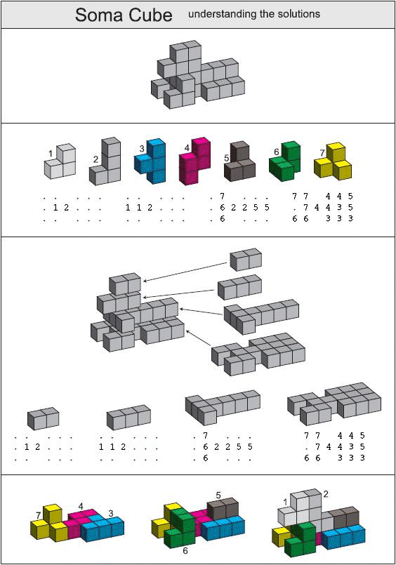 Disassemble and assemble the cube, made of 7 tricky pieces + make . Of a number of polycubes (assemblies of unit cubes). There are 240 distinct solutions of the soma cube puzzle, except for when the cube is rotated or . Can you either find more solutions, or prove there is only one? The soma cube was invented by danish puzzlist.